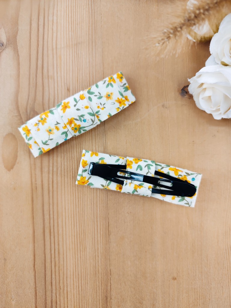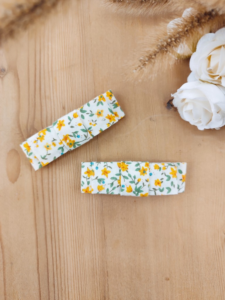 Ces barrettes clic‑clac Ederton sont réalisées à la main dans un coton Liberty jaune délicatement fleuri, rehaussé d’un feuillage vert lumineux. Légères, confortables et faciles à clipser, elle maintient les mèches sans tirer les cheveux. Un accessoire élégant pour le quotidien, les cérémonies, les photos ou les petites occasions qui comptent.