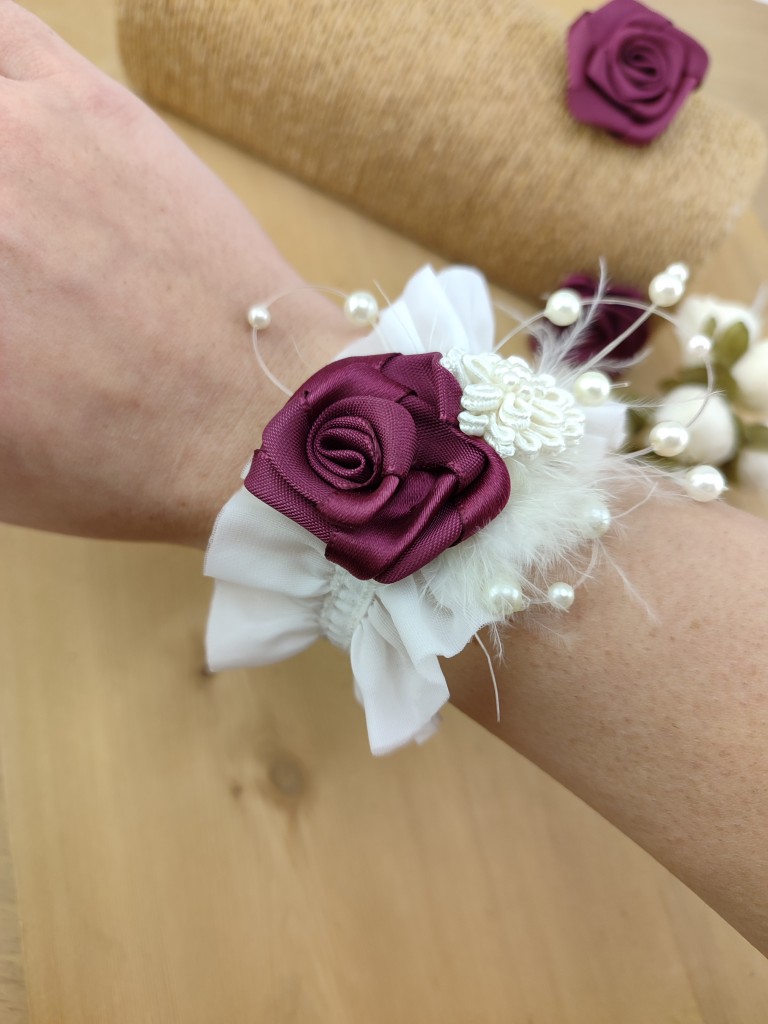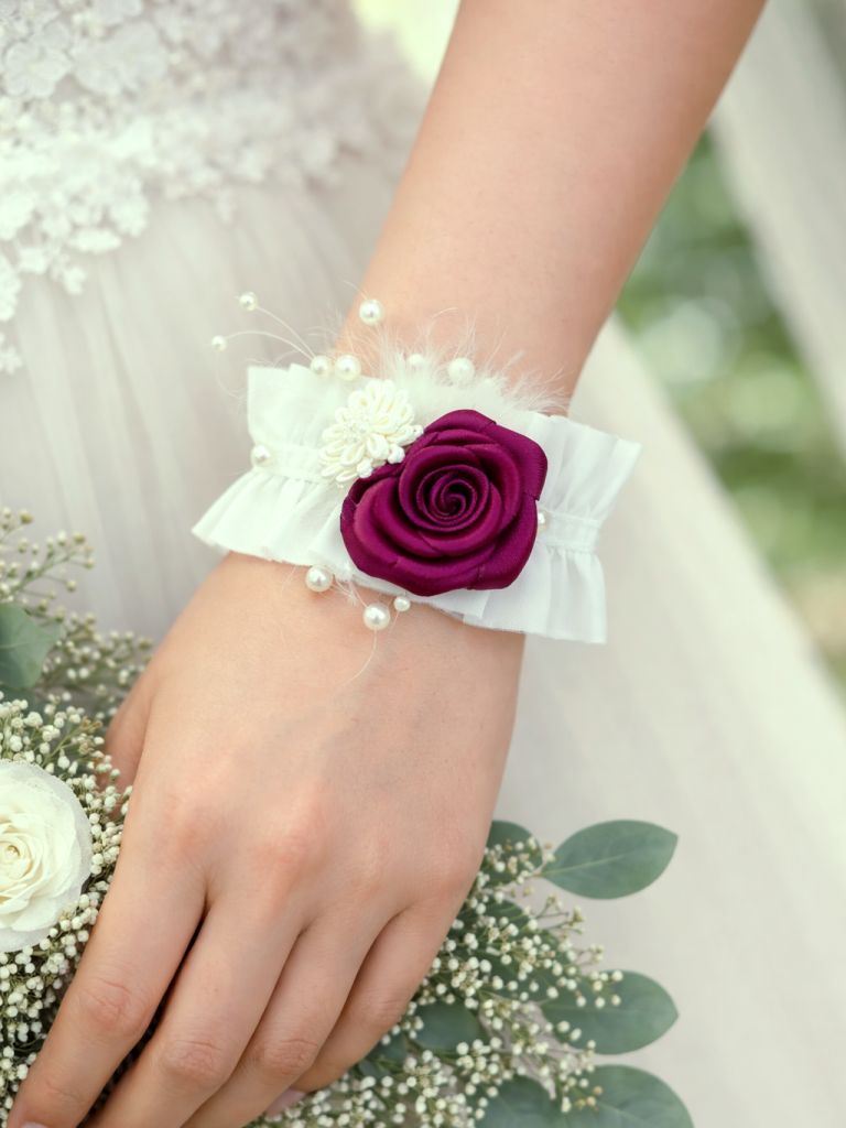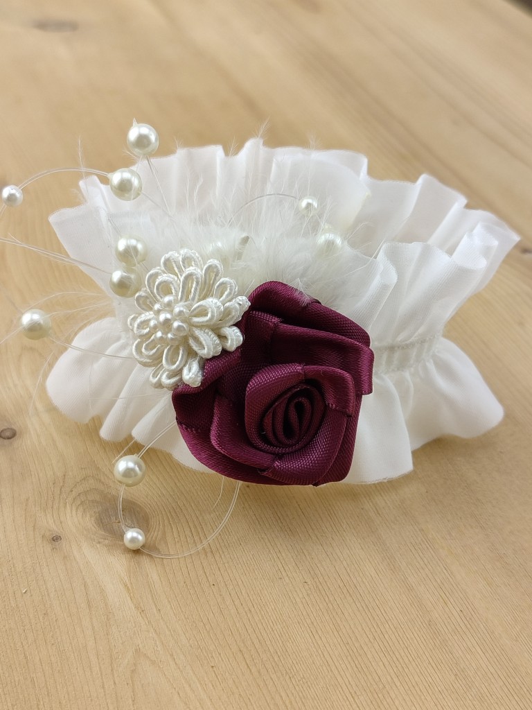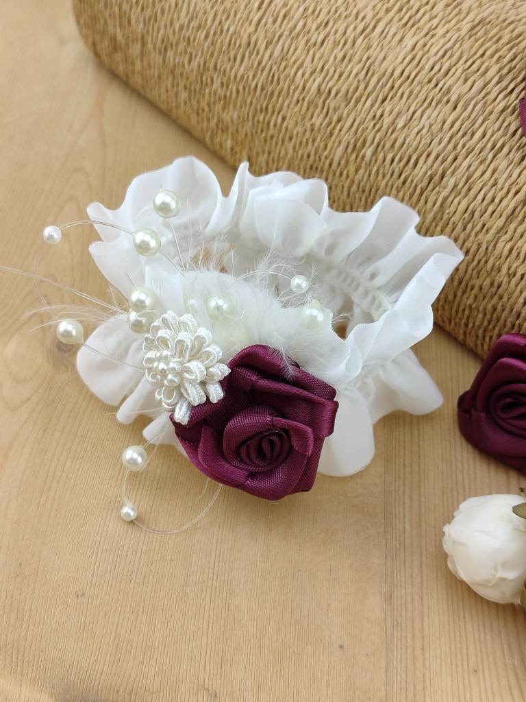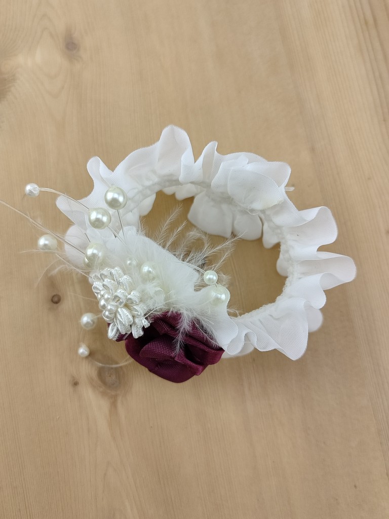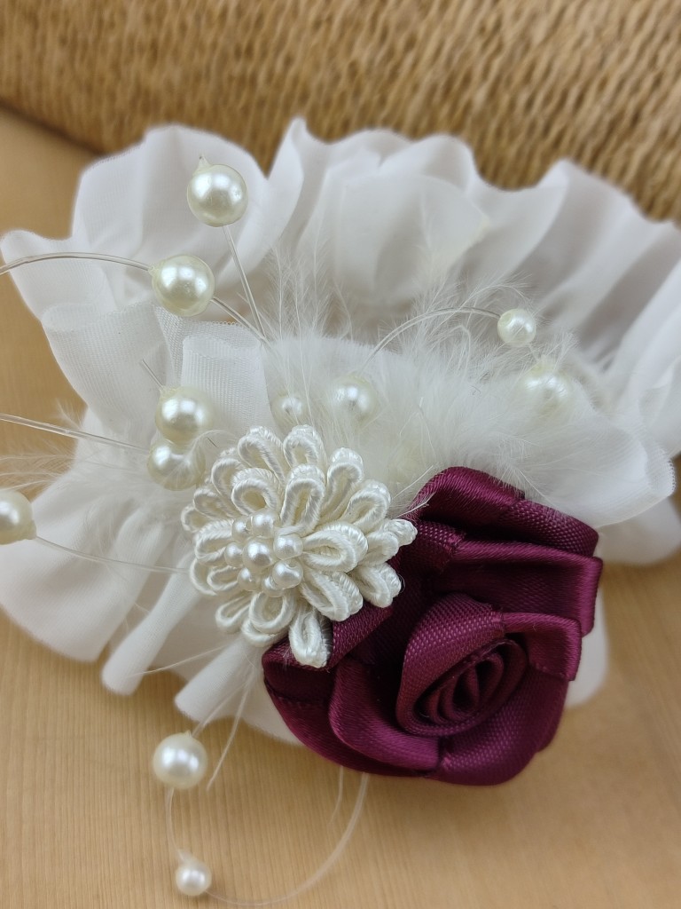 Réalisé à la main dans notre atelier, il marie avec raffinement d'une fleurs en tissu bordeaux, de petites perles lumineuses et une plume d’autruche aérienne, pour un effet à la fois sophistiqué et naturel.