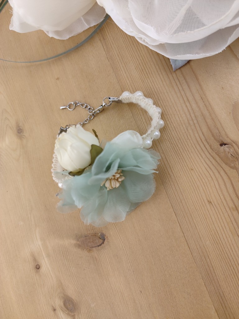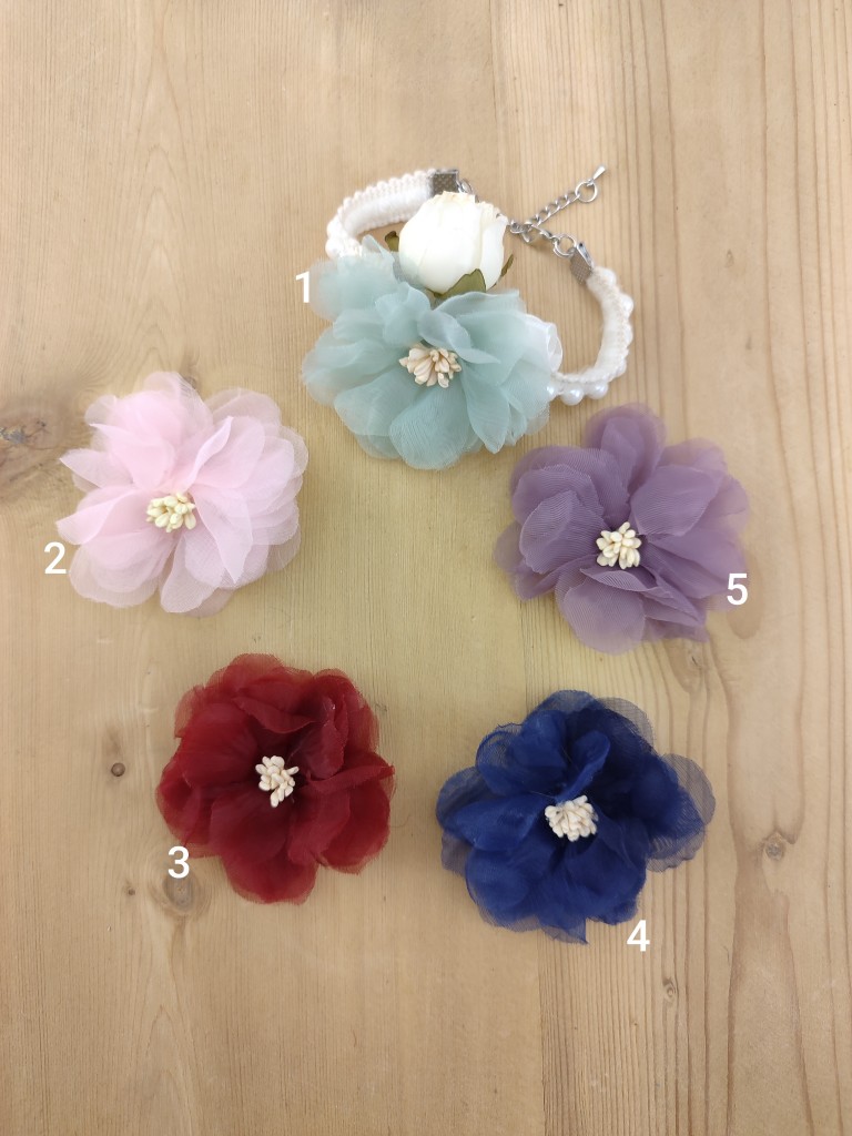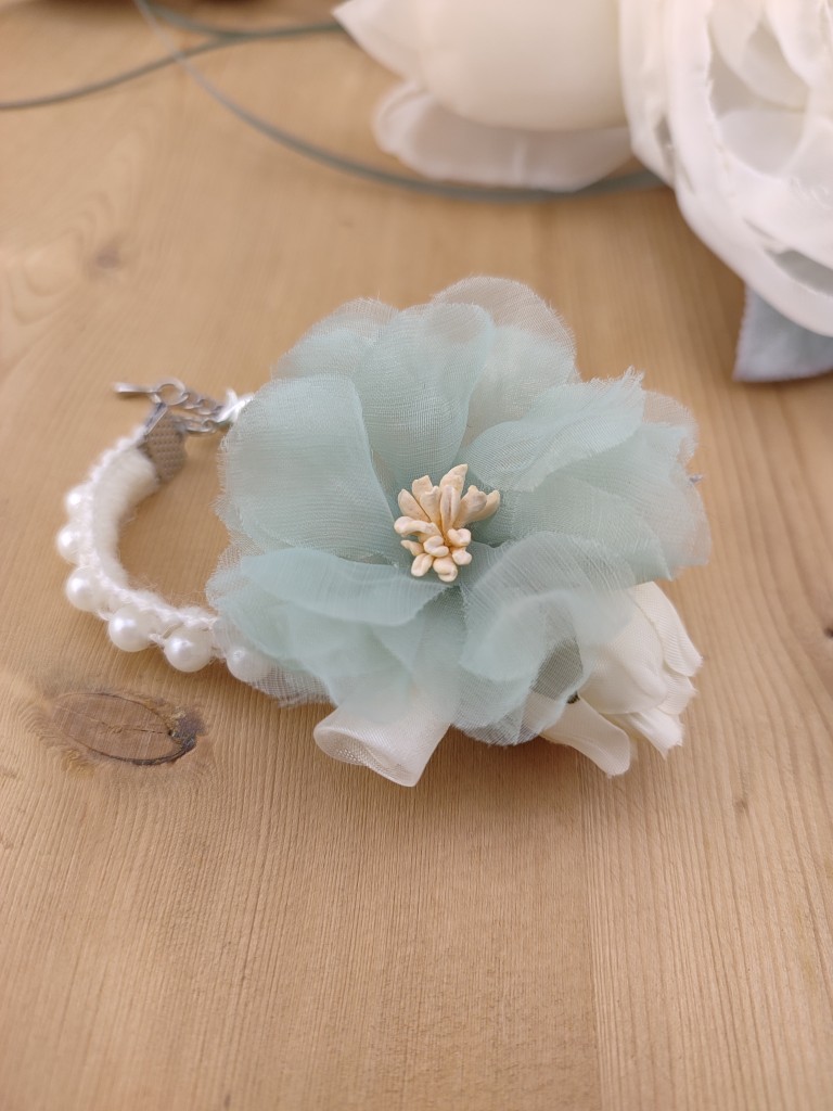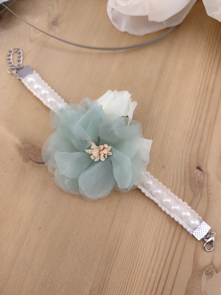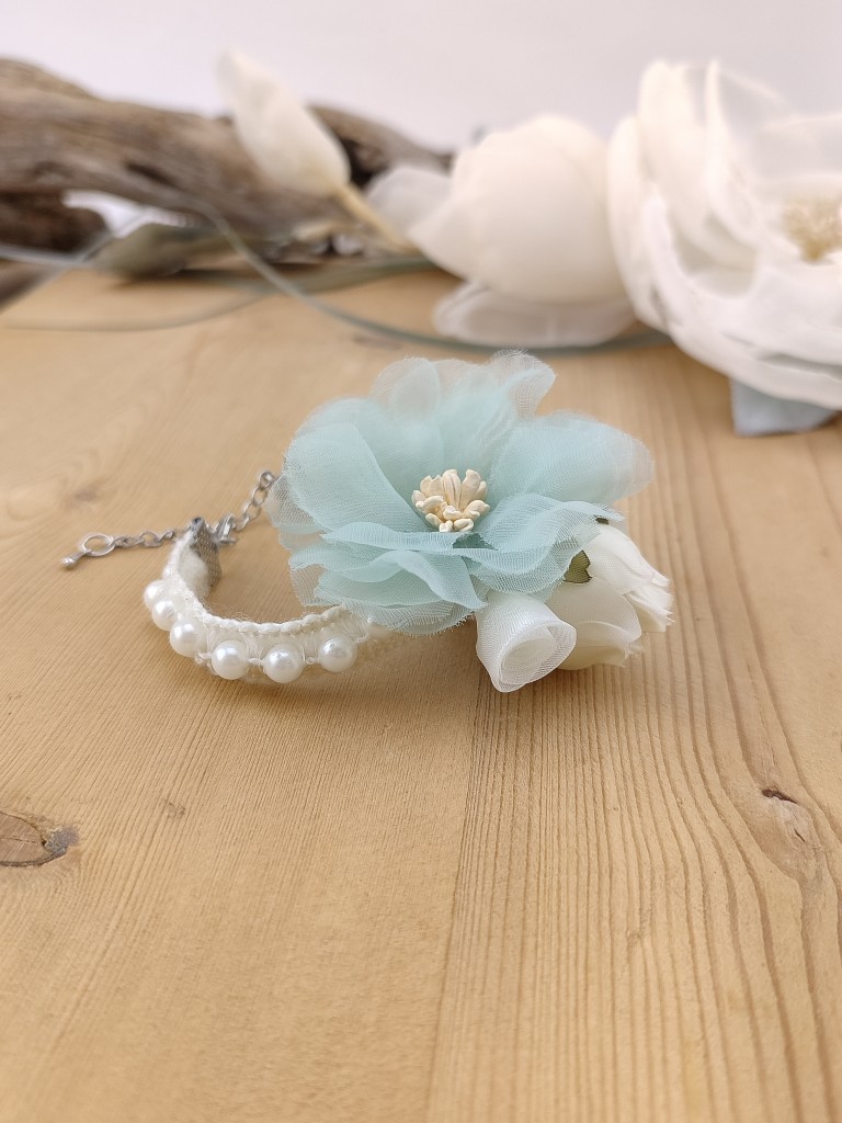 Chaque bracelet est personnalisable : choisissez la couleur de la fleur pour harmoniser l’accessoire à votre tenue ou au thème de votre mariage. (Le modèle sur la photo est réalisé avec la fleur n°1)