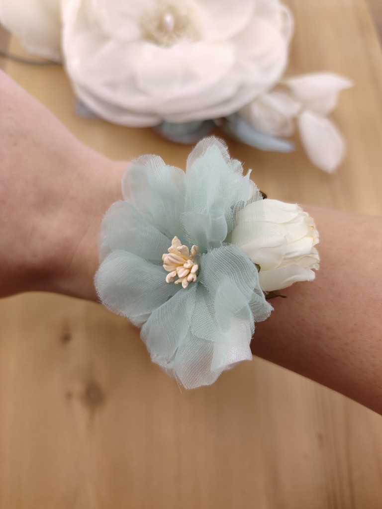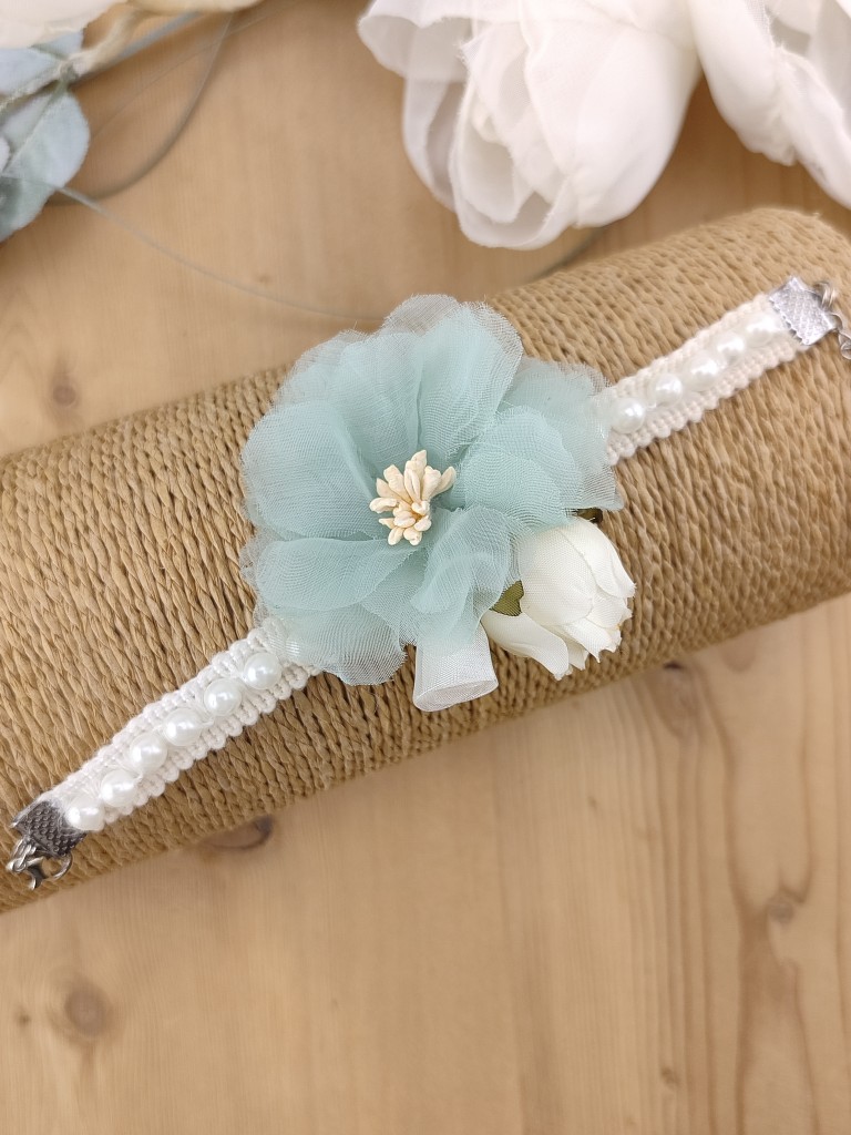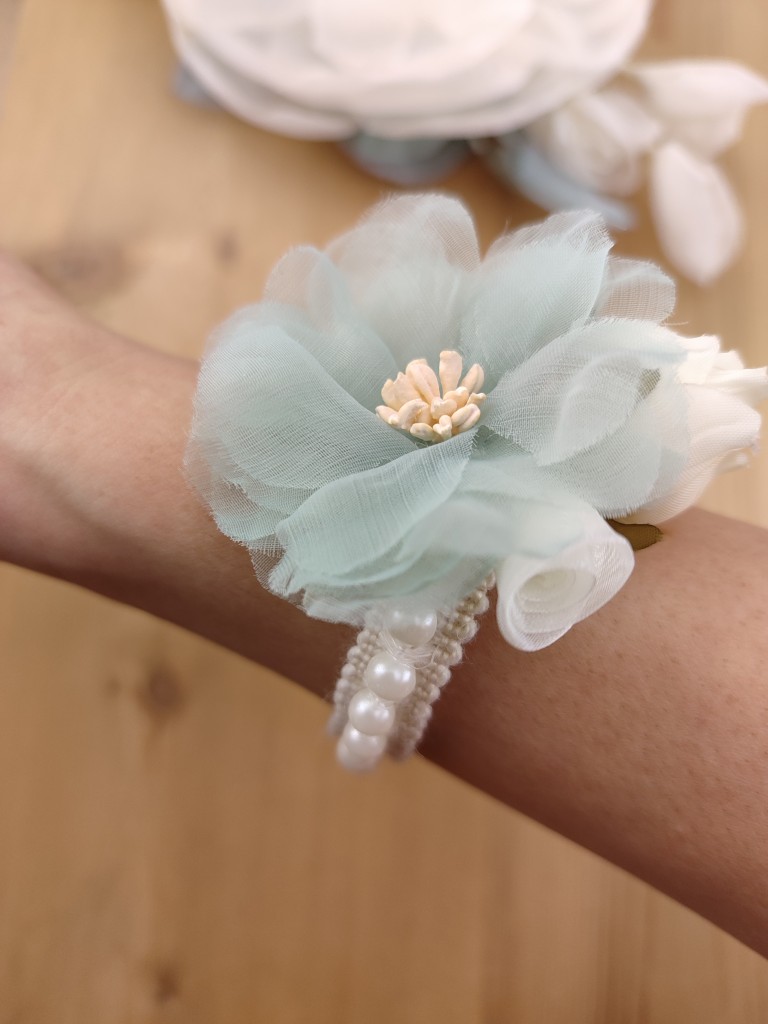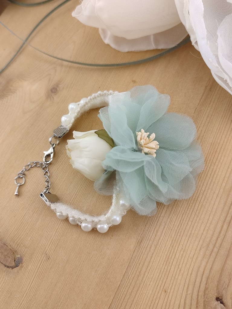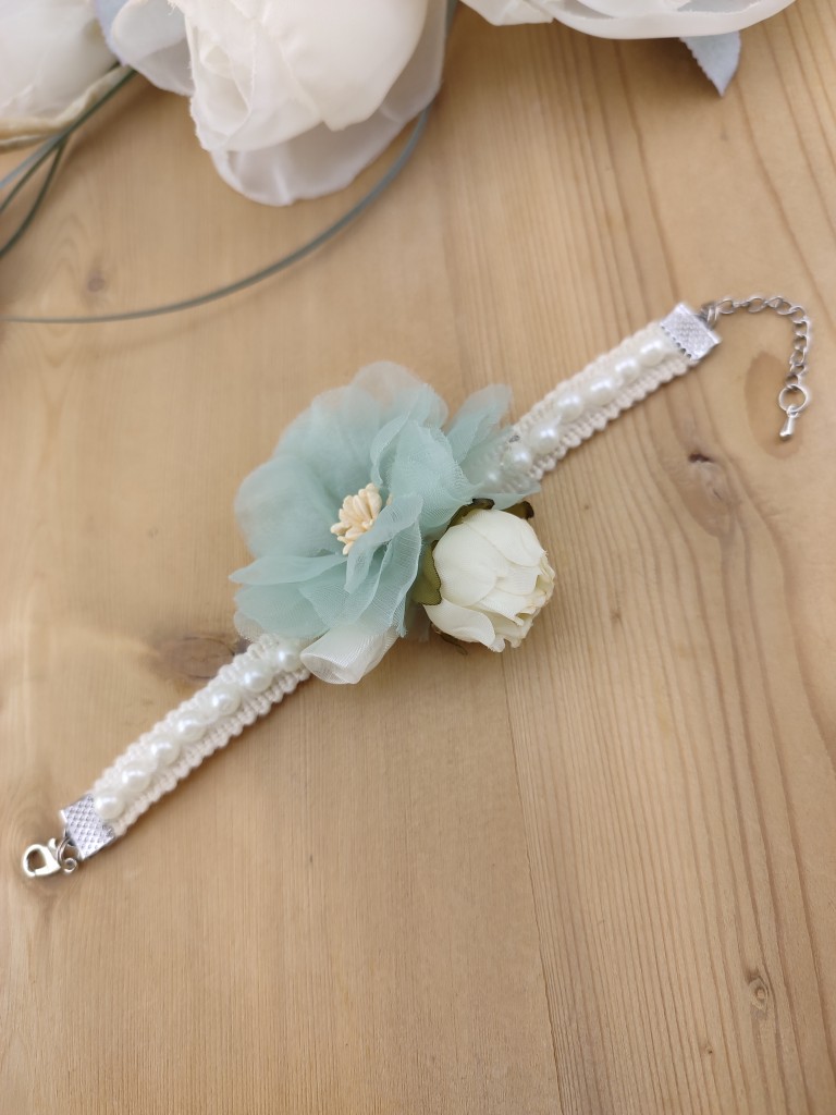 Chaque bracelet est personnalisable : choisissez la couleur de la fleur pour harmoniser l’accessoire à votre tenue ou au thème de votre mariage. (Le modèle sur la photo est réalisé avec la fleur n°1)