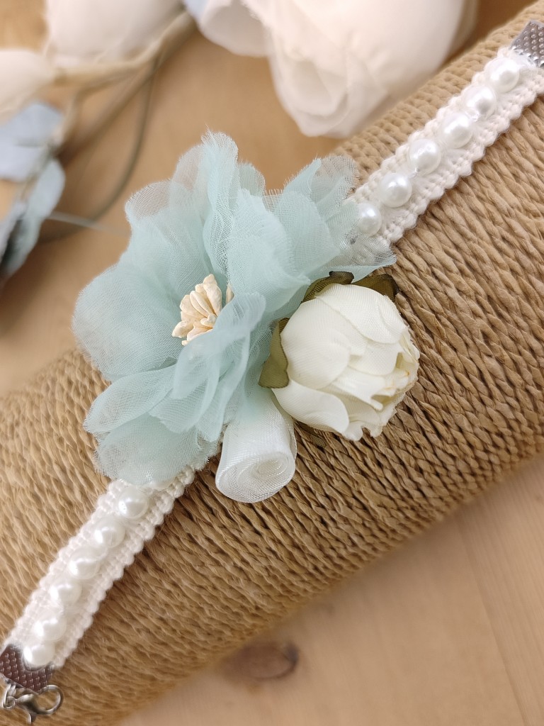 Fait main dans notre atelier de Donzère, il associe douceur des fleurs d’organza, et finesse du ruban avec ses perles nacrées, pour un rendu à la fois romantique et raffiné.