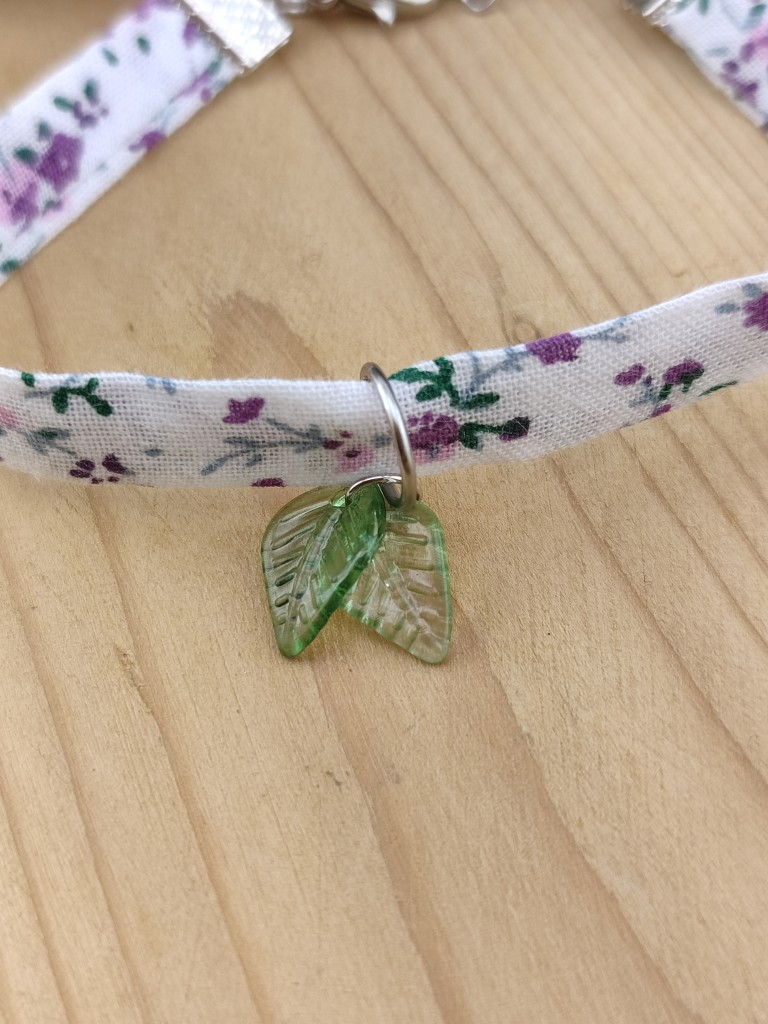 Ce bracelet en tissu Liberty à petites fleurs violettes est sublimé par deux feuilles en résine, délicatement ajoutées pour apporter une touche végétale et élégante.