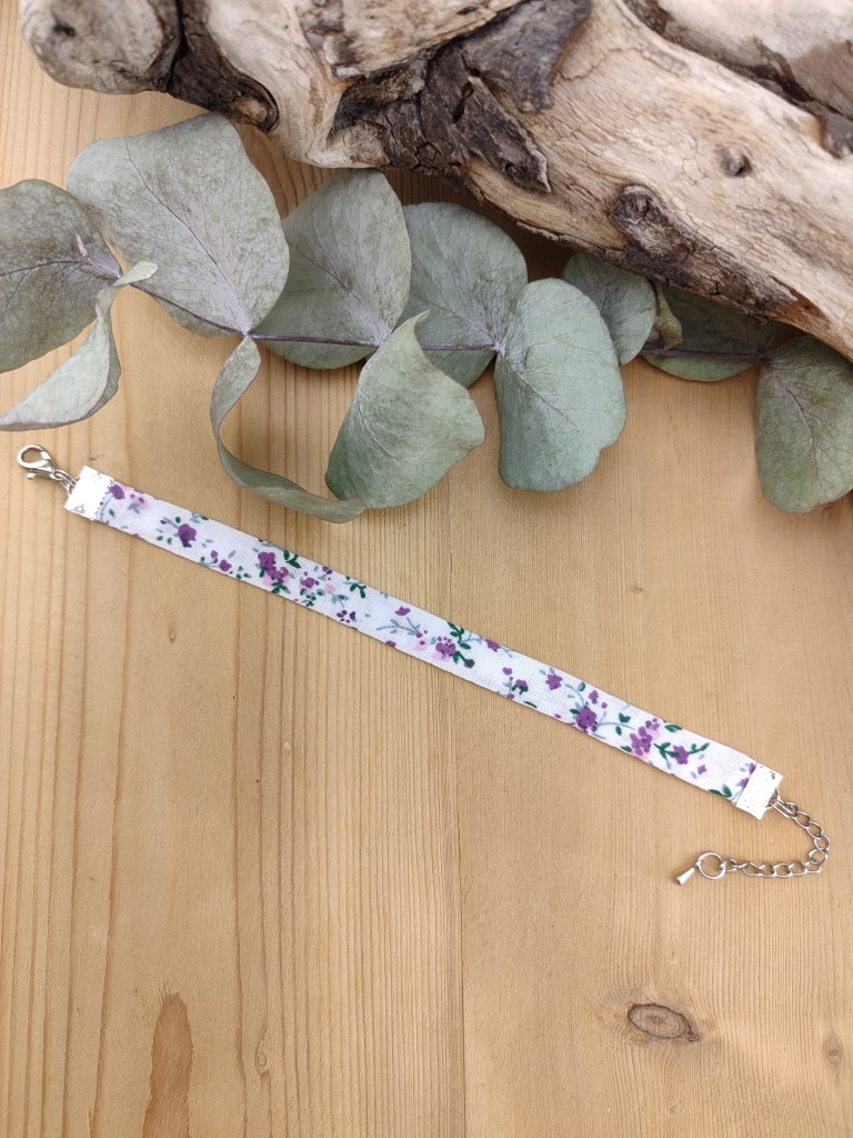 Ce bracelet en tissu Liberty à petites fleurs violettes apporte une touche élégante et délicate au poignet.