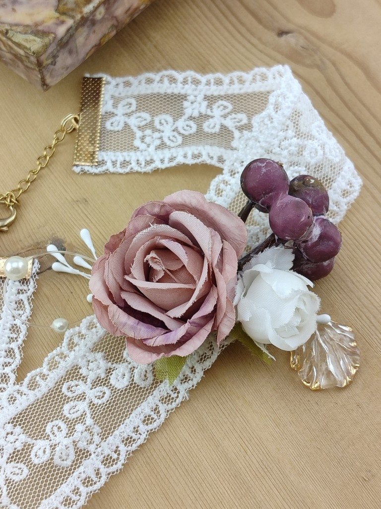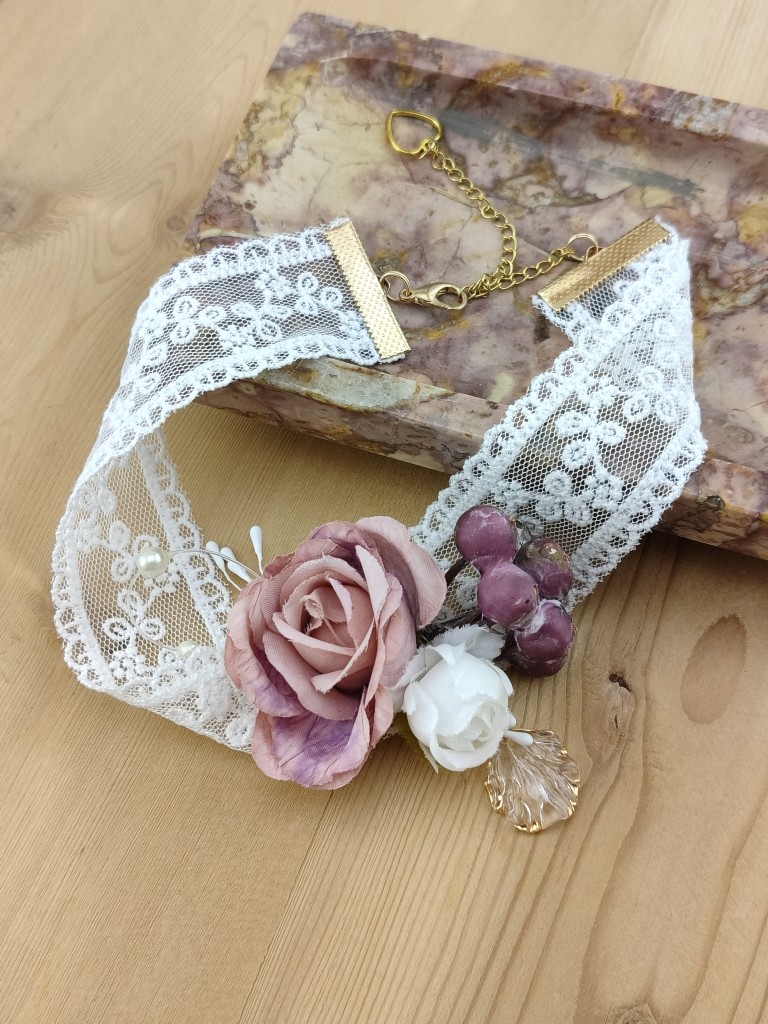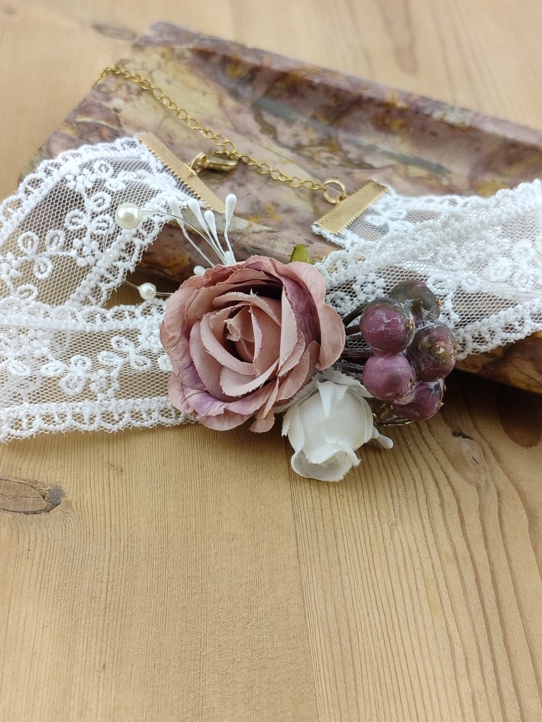 Monté sur une délicate dentelle souple et confortable, il dévoile un assemblage harmonieux de fleurs et d’éléments décoratifs dans des tons vieux rose, ivoire et doré.