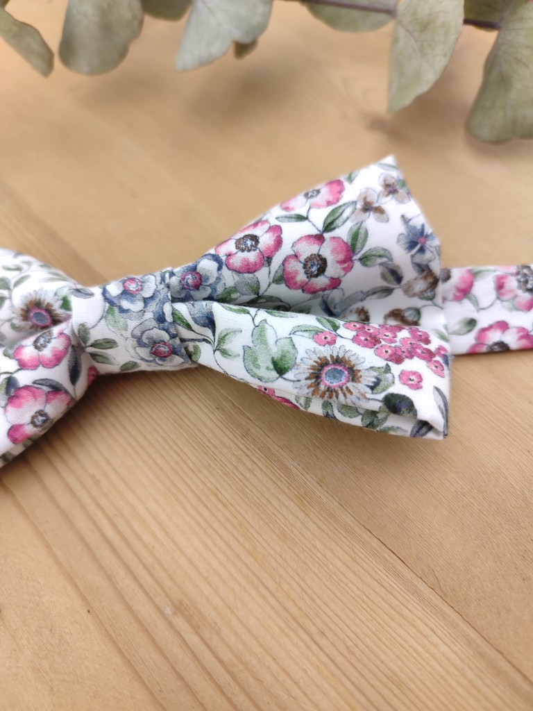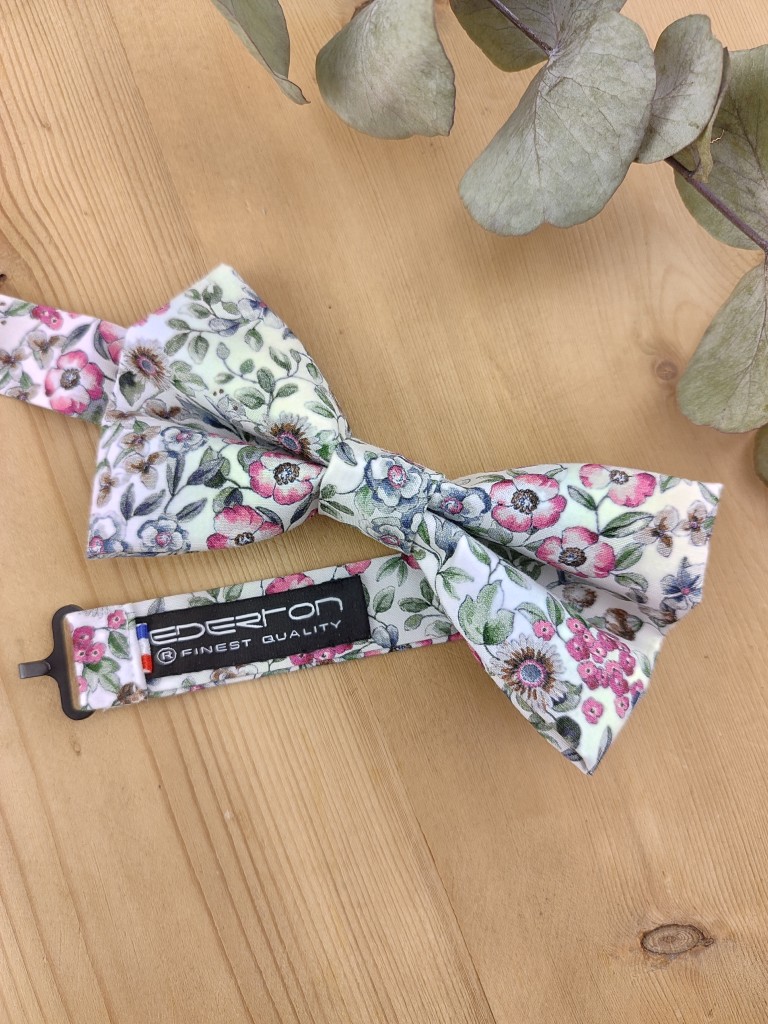 Apportez une touche florale élégante à votre tenue avec ce nœud papillon Ederton au motif délicat de fleurs roses sur fond blanc, sublimé par un feuillage vert sauge tendance.