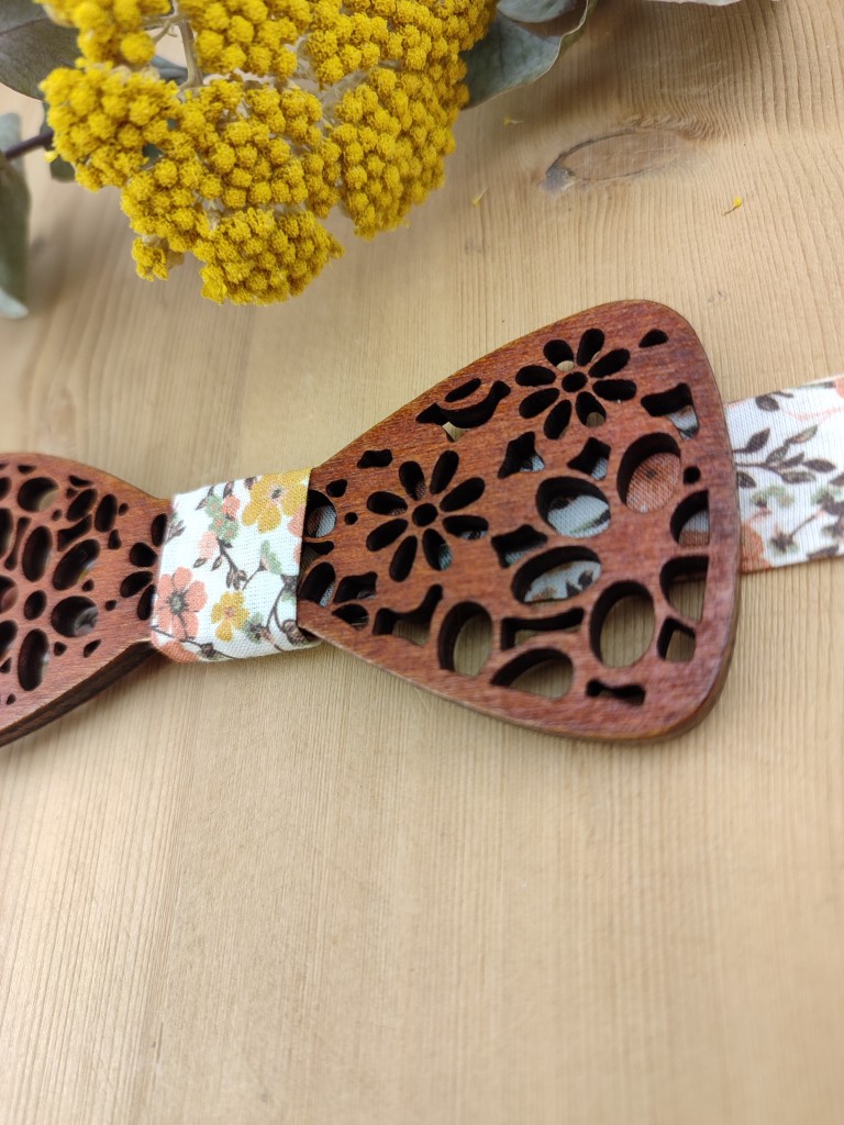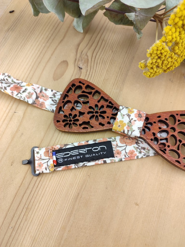 Découvrez le nœud papillon Ederton®, une création qui allie l’élégance du bois ajouré et la chaleur d’un tissu orange brûlé.