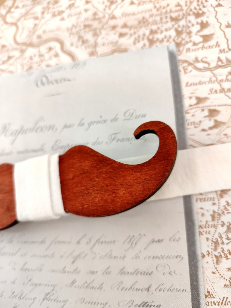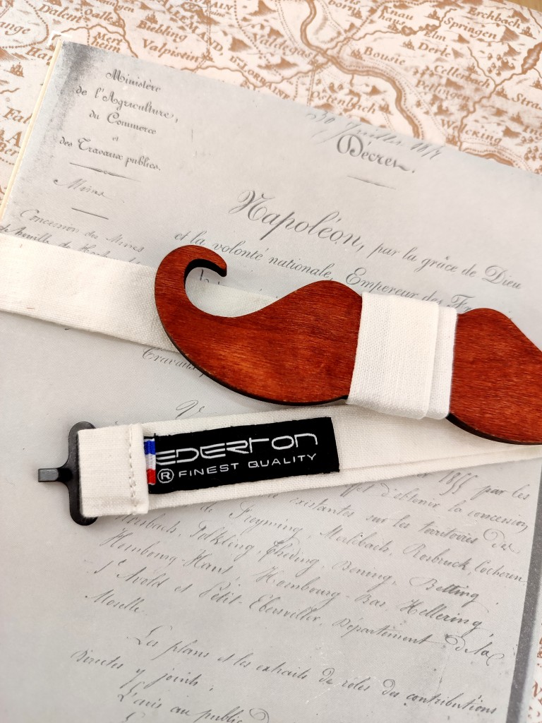Ce nœud papillon moustache en bois, habillé d’un tissu ivoire assorti pour le tour de cou et la partie centrale, allie originalité et élégance.