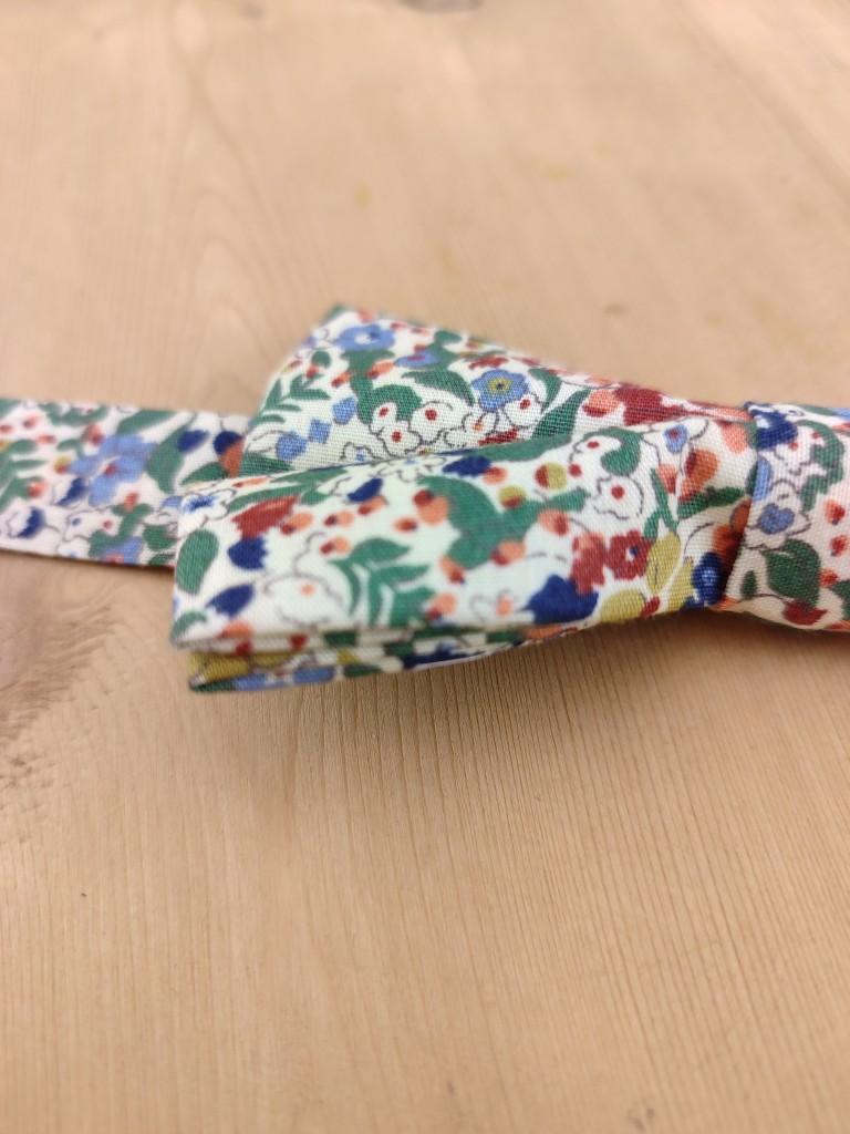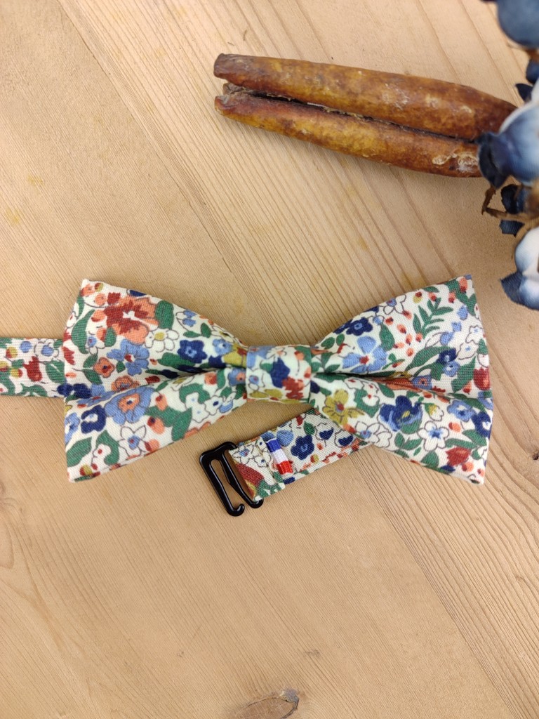 Un adorable nœud papillon enfant aux motifs fleuris bleu, terracotta et vert, confectionné à la main avec soin dans nos ateliers