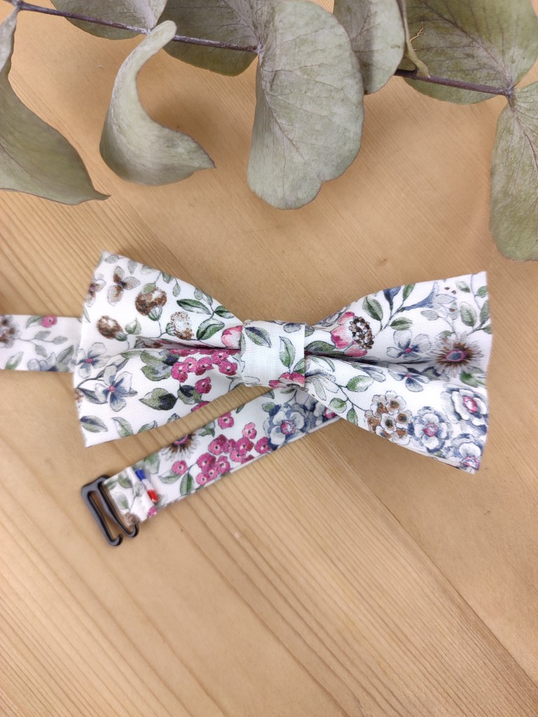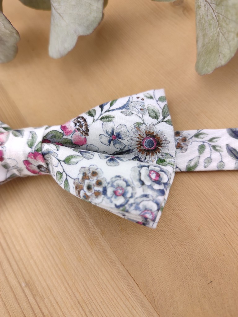 Son motif floral délicat, avec des fleurs roses et un feuillage vert sauge sur fond blanc, apporte une touche douce et raffinée, parfaite pour sublimer une tenue de cérémonie.