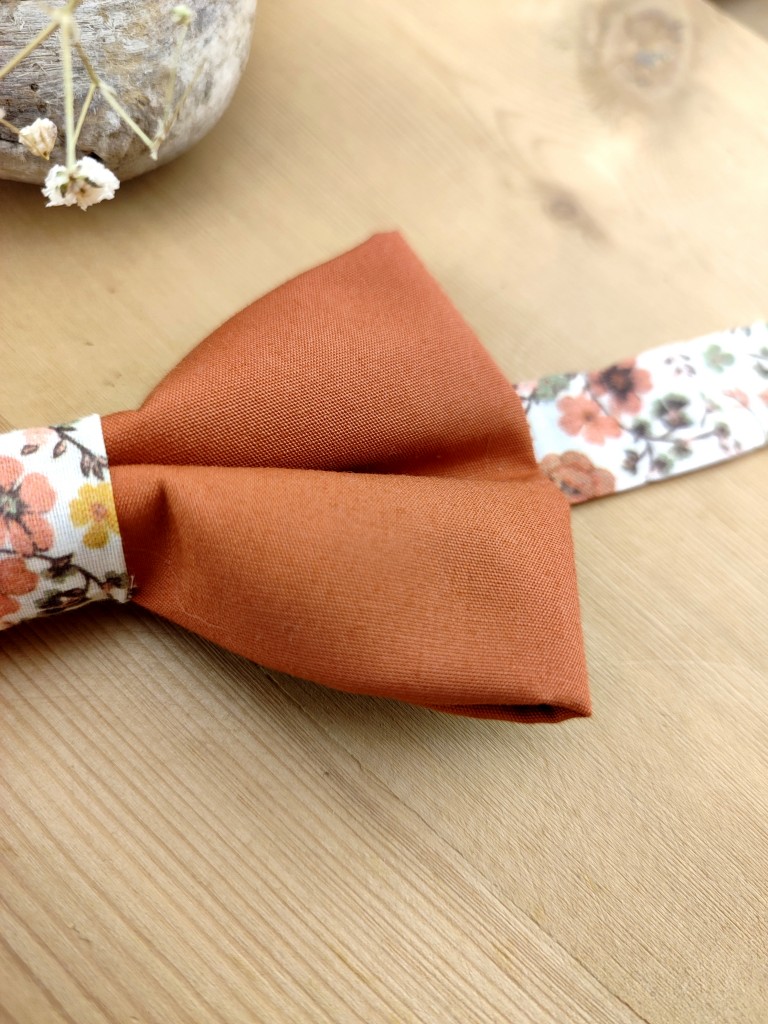 Ce nœud papillon enfant en coton biologique terracotta est sublimé par un centre en tissu Liberty fleuri, apportant une touche délicate et élégante à une tenue de cérémonie.