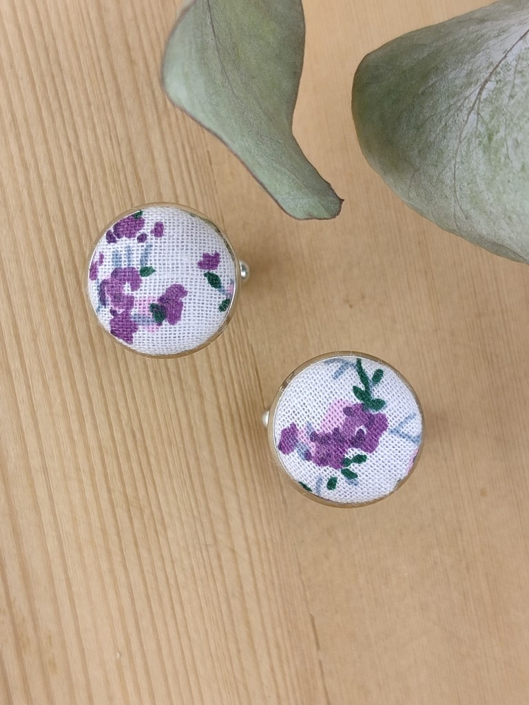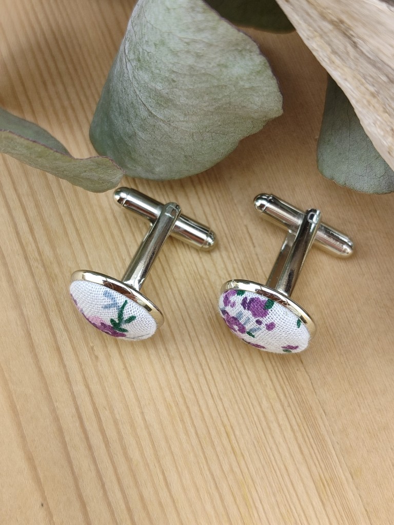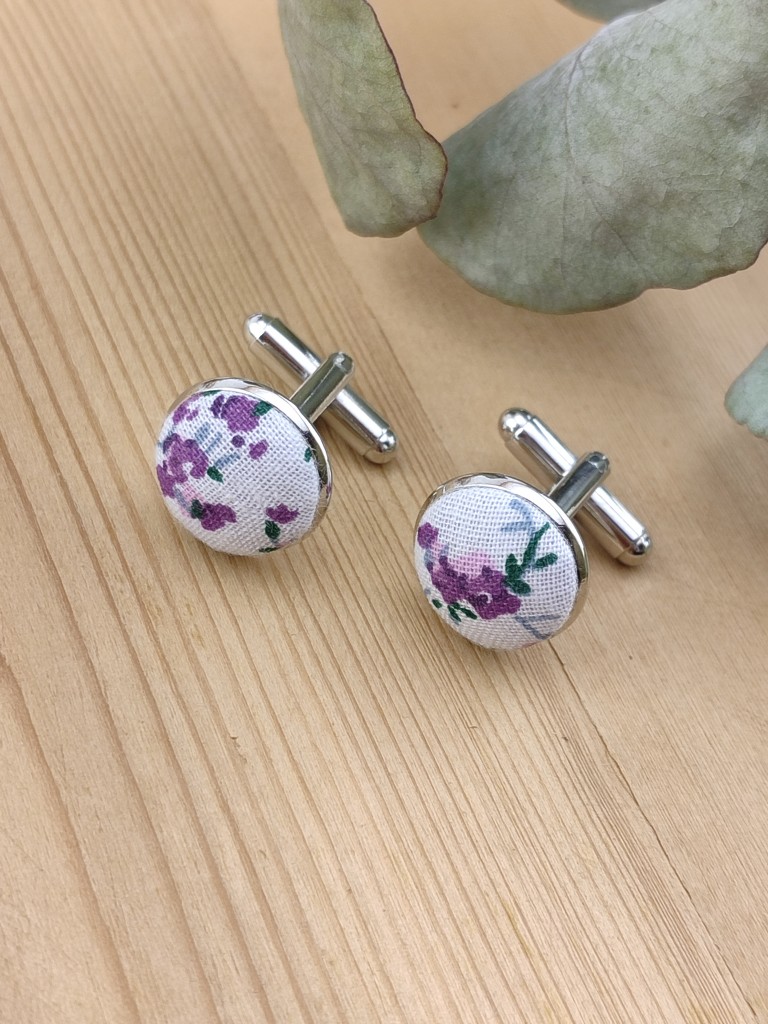 Ces boutons de manchette en tissu liberty violet à petites fleurs sont fabriqués à la main dans l’atelier Ederton.