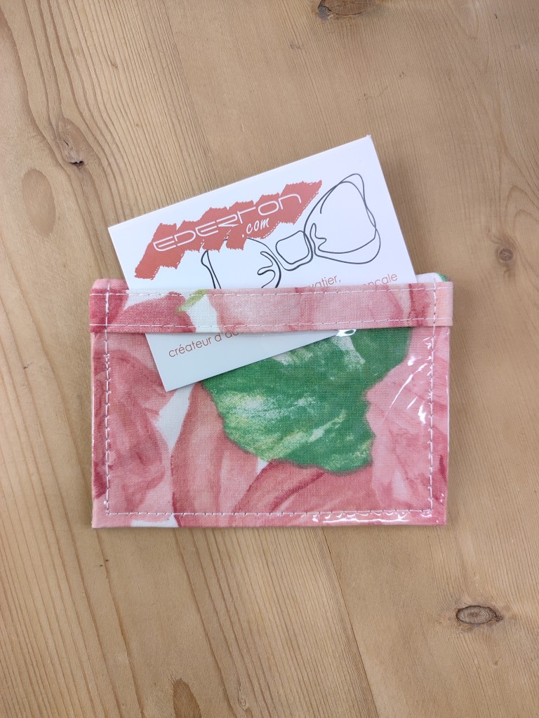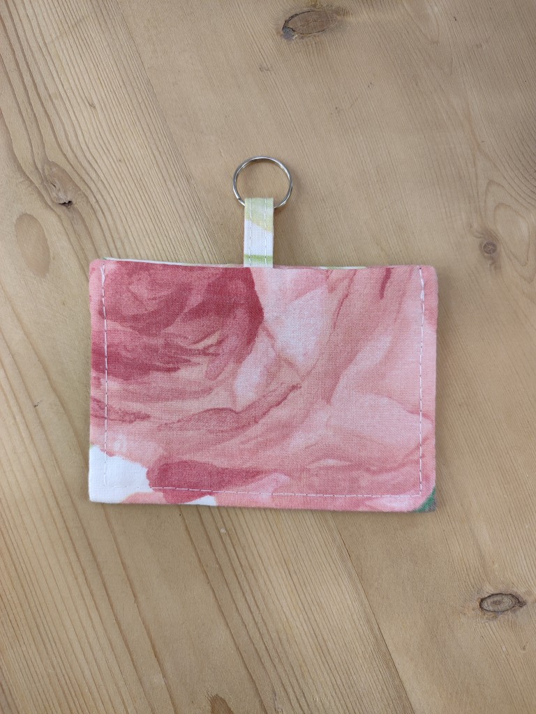 Ce porte-badge en tissu rose est fabriqué artisanalement.