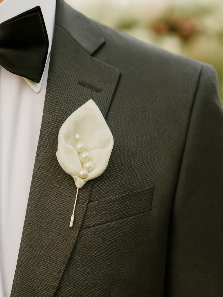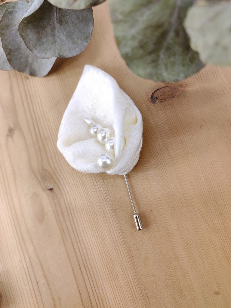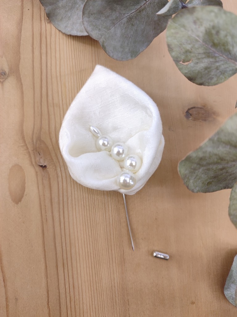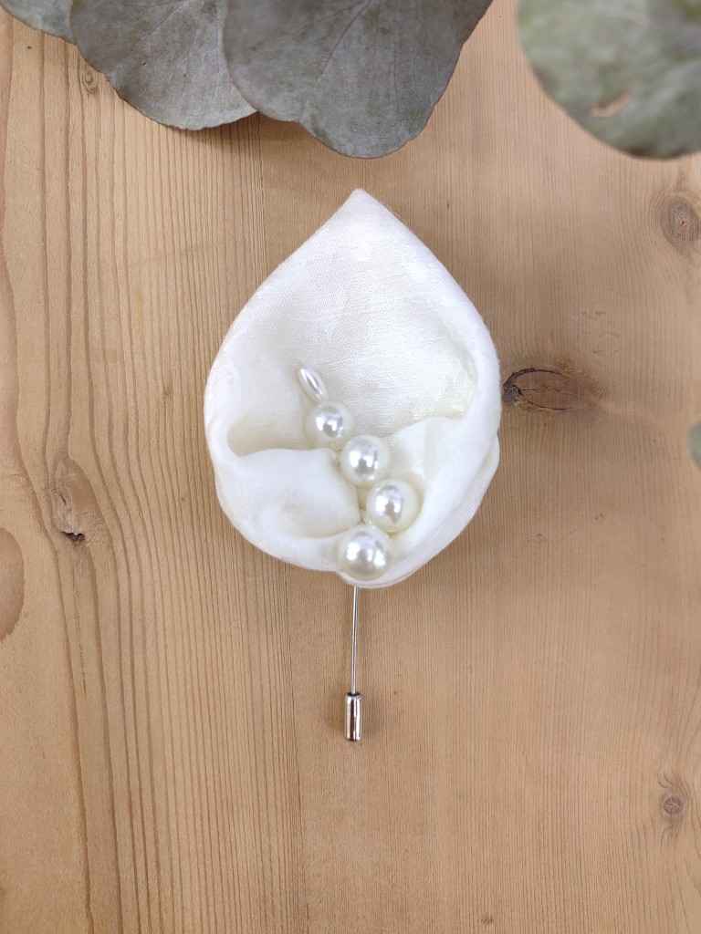 Cette boutonnière élégante est une création artisanale pensée pour les grandes occasions. Confectionnée dans un tissu ivoire à motif discret et légèrement satiné, elle évoque la délicatesse des fleurs de cérémonie. Sa forme épurée est rehaussée par cinq perles nacrées (quatre rondes de 1 cm et une allongée de 0.8 cm), disposées avec soin pour un rendu chic et intemporel. La tige métallique dépasse de 3.5 cm, assurant une fixation solide sur tout type de veste. Idéale pour les mariés, témoins ou invités souhaitant ajouter une touche d’élégance à leur tenue.