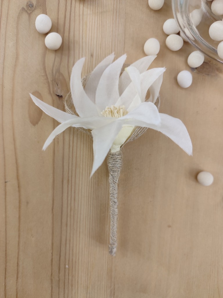 Cette élégante boutonnière Ederton® met en valeur une fleur de lys ivoire en tissu avec son ruban de lin, travaillée avec soin pour offrir un rendu raffiné, intemporel et parfaitement adapté aux mariages et cérémonies.