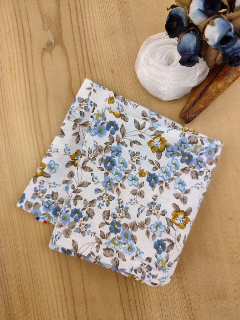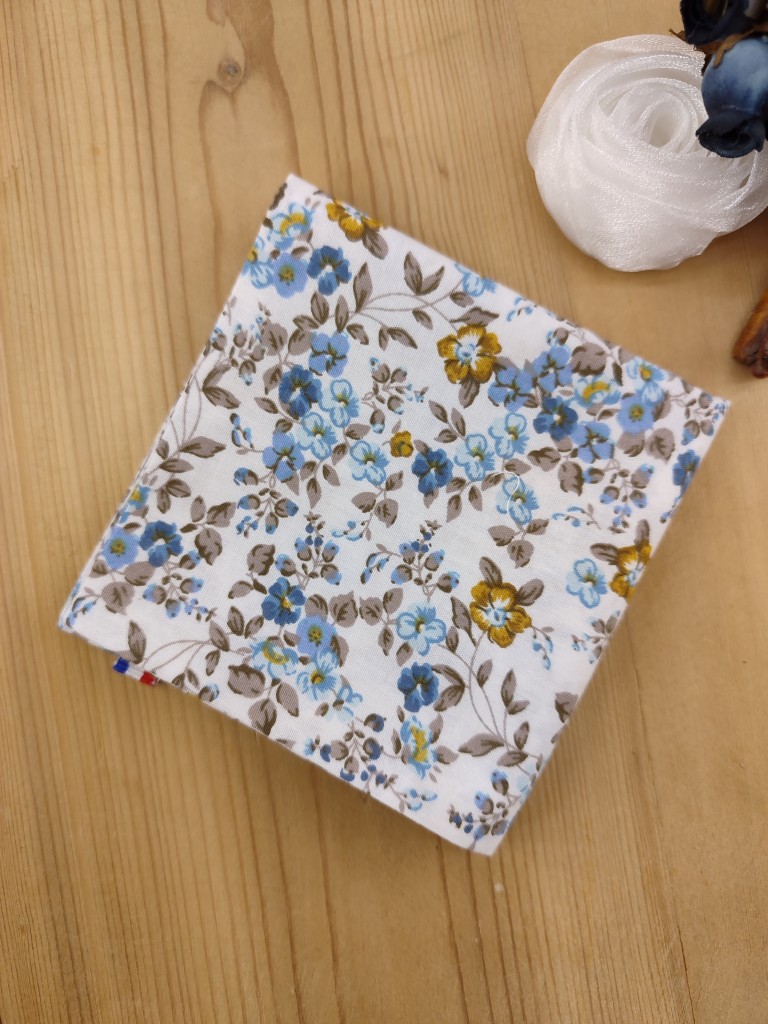 Sublimez vos tenues avec une pochette au design unique, mêlant la délicatesse des fleurs bleues, la chaleur subtile d’une pointe de moutarde et la douceur du feuillage taupe, le tout posé sur un fond blanc éclatant.