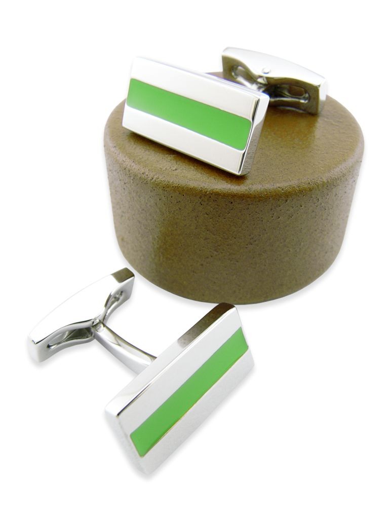 Rectangulaire et de dimensions réduites (20 par 10 millimètres), la platine de ce bouton de manchette est en métal. Elle est traversée horizontalement en son centre par une bande en émail vert amande, sur un peu plus du tiers de la hauteur.