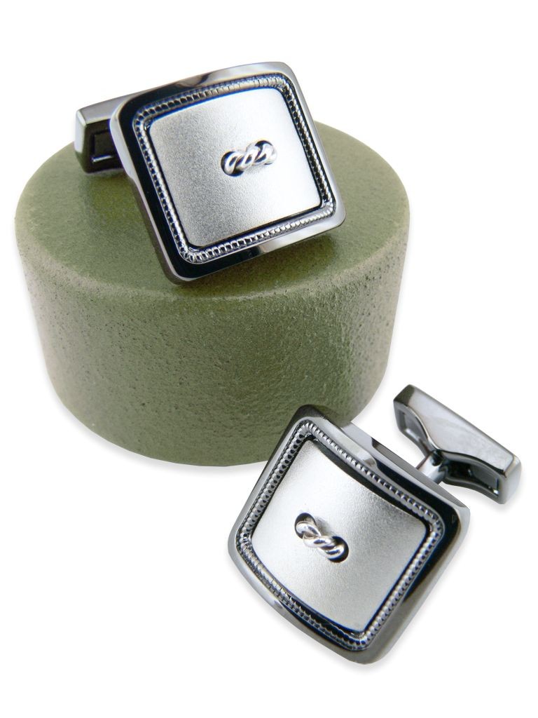 Bouton de manchette carré réalisé en métal plaqué bronze brillant sur l'ensemble de sa surface à l'exception de la partie centrale de la platine, plaquée en rhodium finition mate.